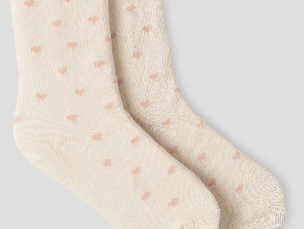 Strømpebukser i råhvid nuance med lyserøde hjerter fra Lil' Atelier. De fine strømpebukser har elastik i taljen, der giver en god pasform og gør dem behagelige at have på. Jacquardstrikken med hjerter giver et sødt og klassisk udtryk.