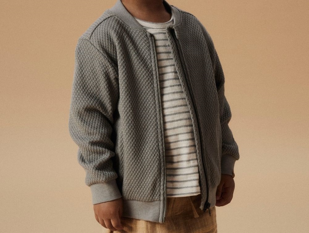 Denne bløde sweatcardigan er lavet af 100% økologisk bomuld i en jacquardvævet kvalitet, der giver et elegant udtryk. Designet har en rund hals, lange ærmer og ribkanter ved manchetterne, der sikrer en behagelig pasform.