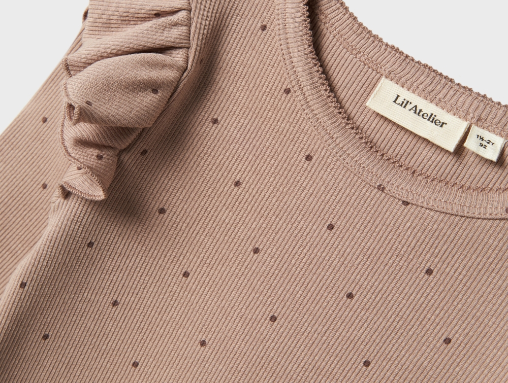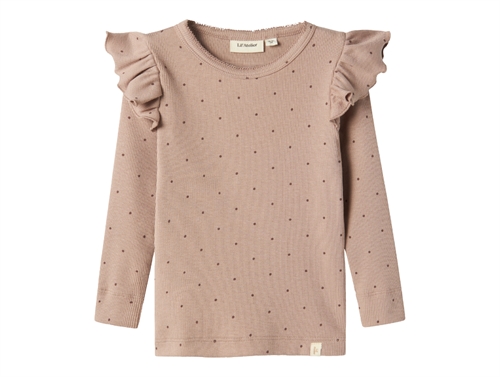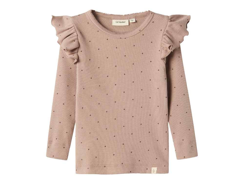 Langærmet top i støvet rosa nuance (etherea) med små prikker og dekorative flæser på skuldrene fra Lil' Atelier.