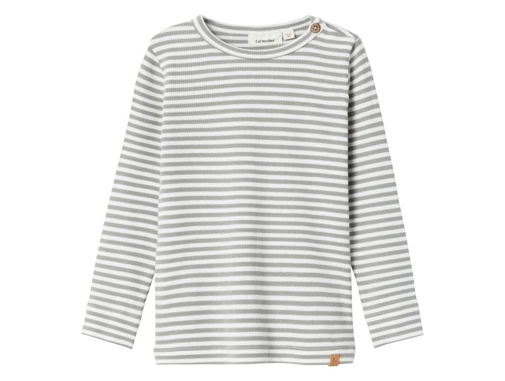 Langærmet top i grå og hvide striber fra Lil' Atelier med knapper ved skulderen.