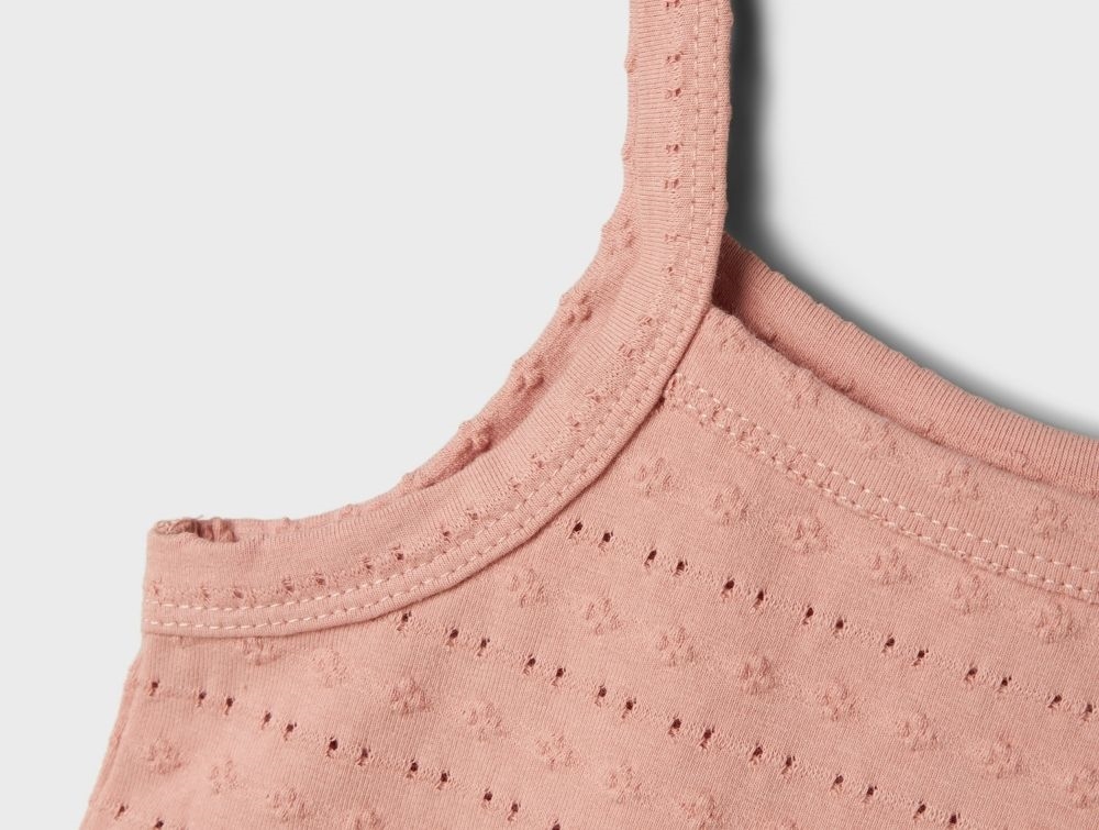 Denne ærmeløse top er fremstillet i en blød og strækbar strukturjersey med hulmønster, der giver et let og feminint udtryk. Den løstsiddende pasform og de brede stropper gør den behagelig og ideel til varme dage.