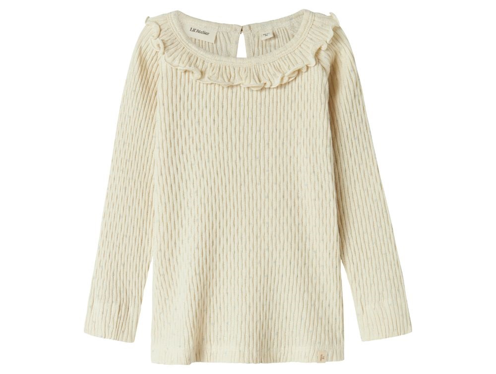 lil\' atelier top i creme med flæsekant ved halsen og hjerter, set forfralil\' atelier top i creme med smal rib og flæsedetalje, tæt på halsudskæringen