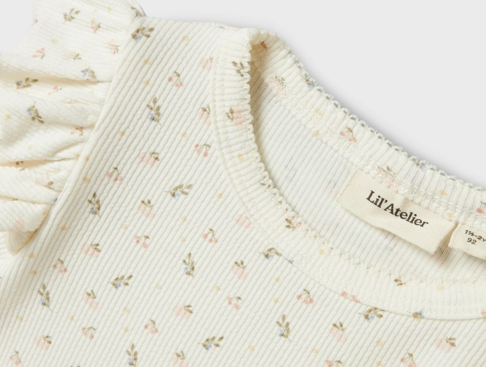 T-shirt fra Lil\' Atelier i coconut milk med blomsterprint og flæserNærbillede af ribstruktur og blomsterprint på Lil\' Atelier t-shirt i coconut milk