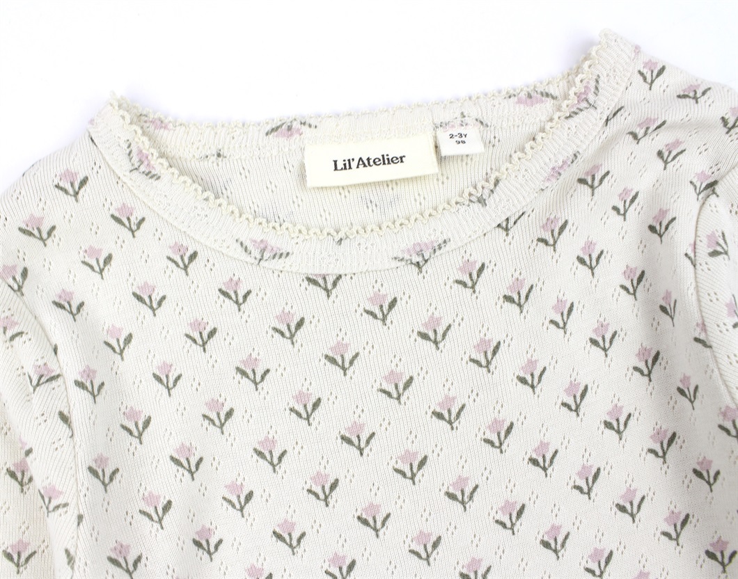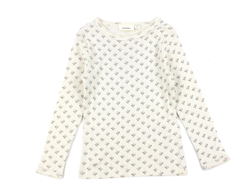 Bluse i farven turtledove med skønt hulmønster og blomsterprint fra Lil' Atelier.