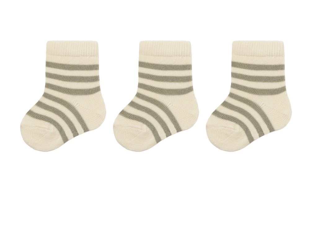 Pakken indeholder tre par strømper i råhvid (turtledove) med grønne (forest fog) striber. Strømperne er lavet i en blød bomuldsblanding med god pasform og let stretch, som gør dem behagelige til hverdagens aktiviteter.