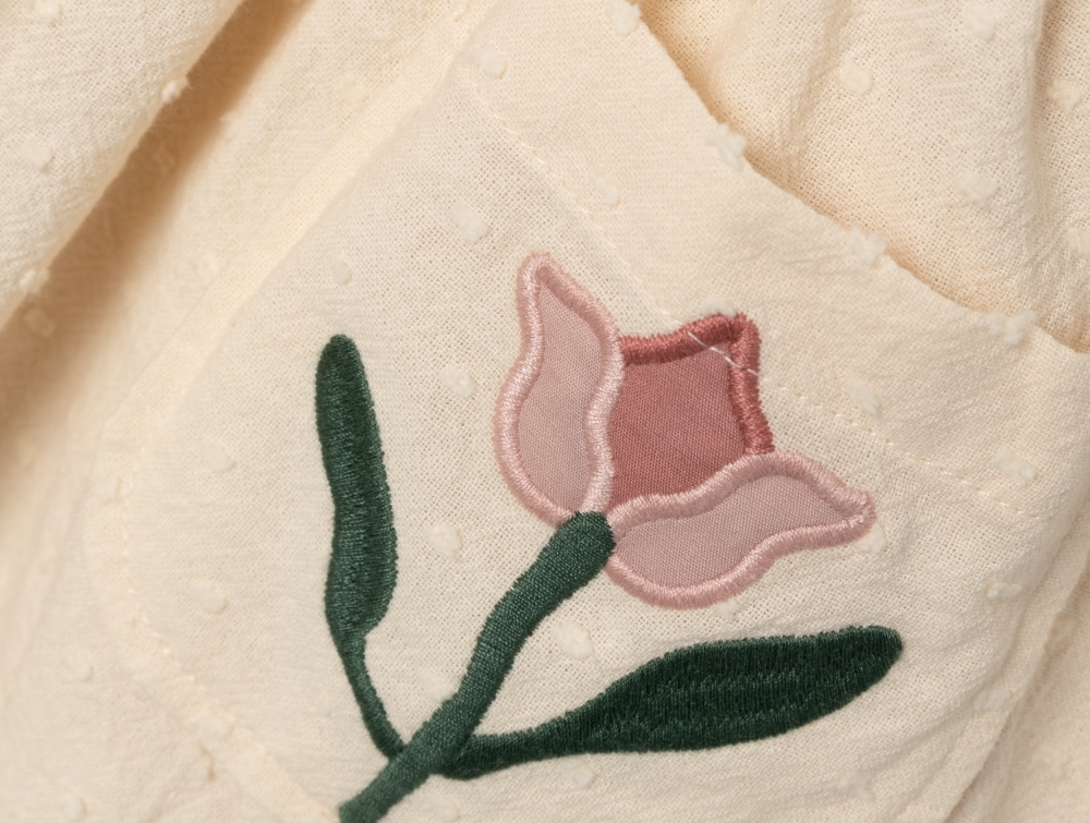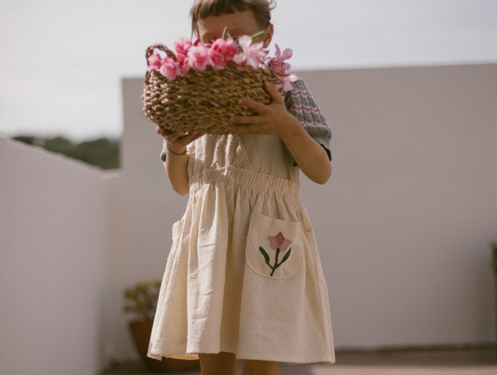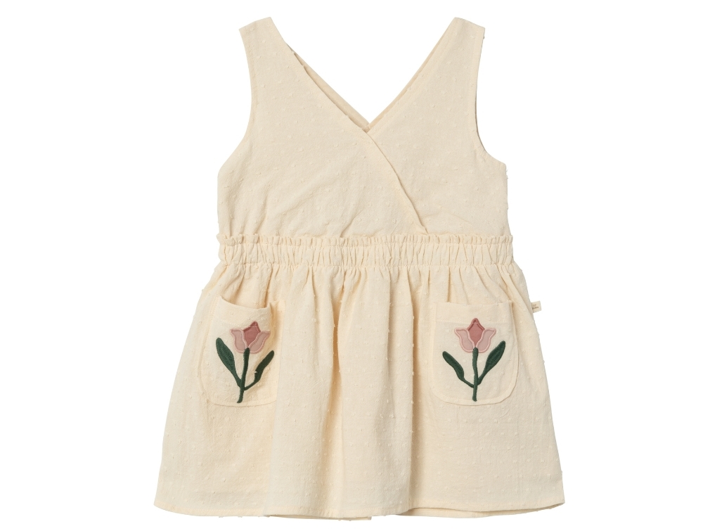 Kjolen har to små lommer med fine blomster og en underkjole i økologisk bomuld. Denne kjole er et godt valg til både fest og leg.