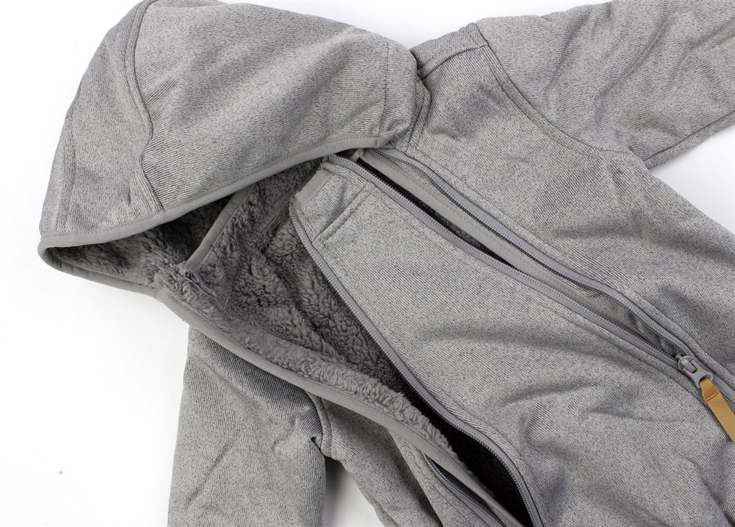 Heldragten lukkes med to skrå lynlåse og har slå-om funktion til fødder og hænder.