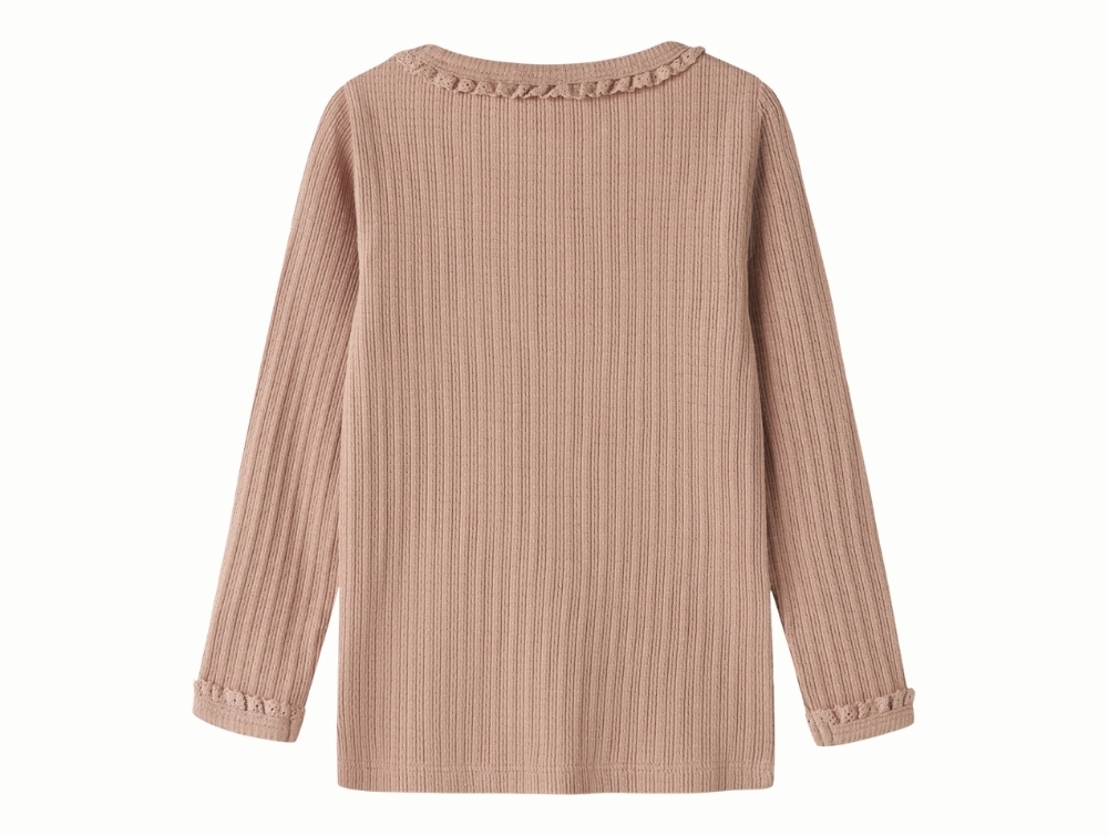 Lil\' Atelier bluse i rosabrun nuance med ribstruktur set forfraLil\' Atelier bluse i rosabrun nuance med blondekant ved halsLil\' Atelier bluse i rosabrun nuance med ribstruktur set bagfra