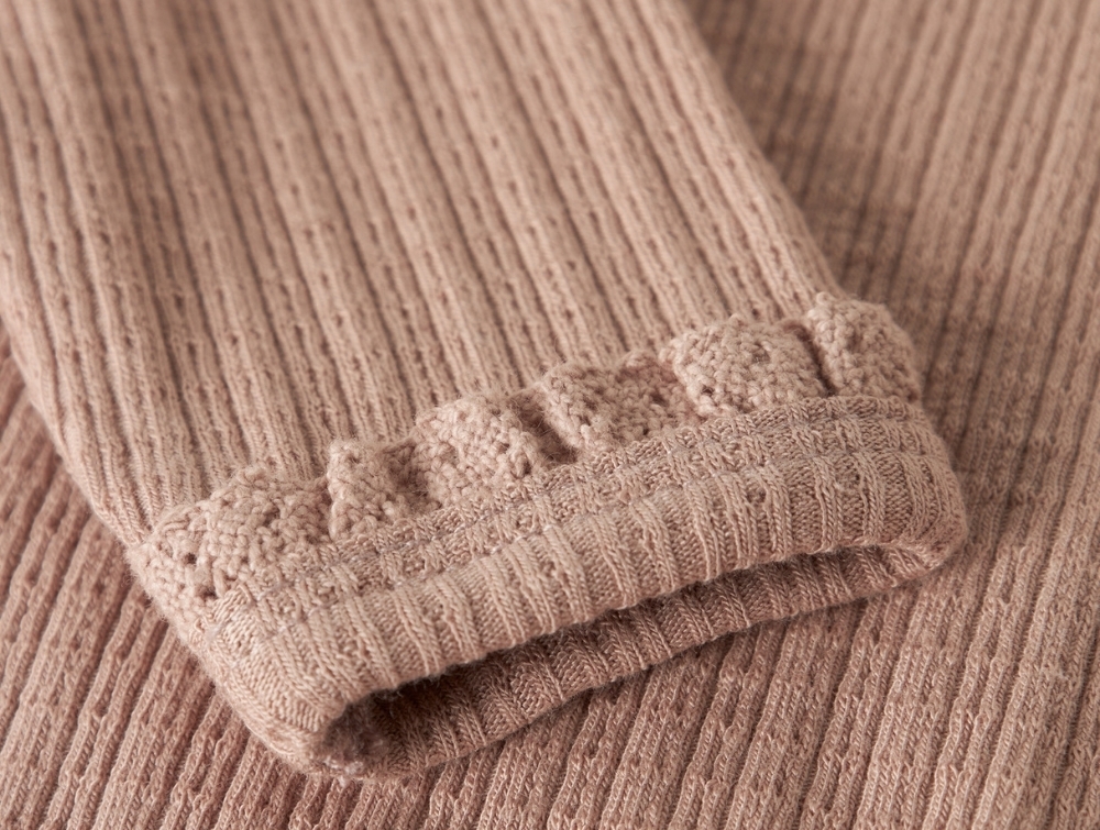 Modellen er fremstillet i blød rib med dekorativ blondekant ved halsen og fine afslutninger ved ærmerne.
