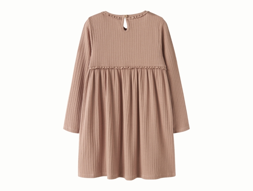 Lil\' Atelier kjole i brun nuance med ribstruktur set forfraLil\' Atelier kjole i brun nuance med ribstruktur og blondedetalje ved halsLil\' Atelier kjole i brun nuance med ribstruktur set bagfra