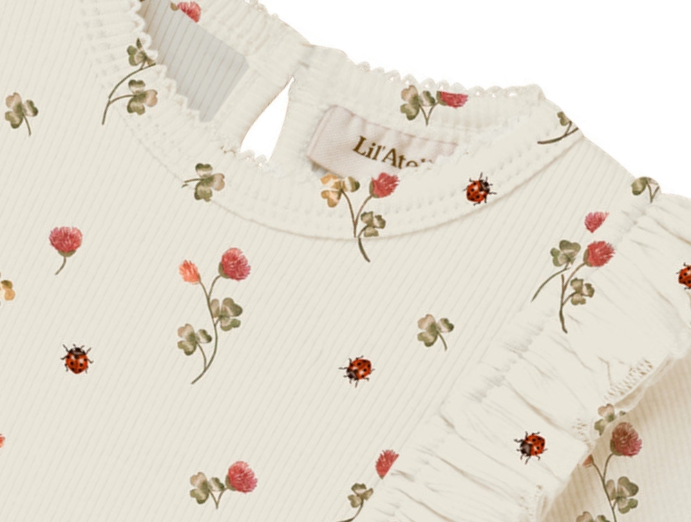 Modellen er fremstillet i blød jersey med fint blomsterprint og små mariehøns samt dekorative flæser foran.