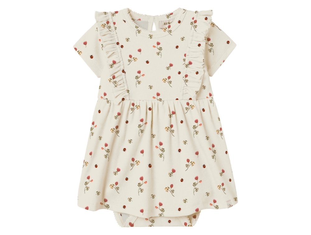 Lil\' Atelier kjolebody i råhvid nuance med blomsterprint set forfraLil\' Atelier kjolebody i råhvid nuance med flæsedetaljer og mariehønsLil\' Atelier kjolebody i råhvid nuance med blomsterprint set bagfra