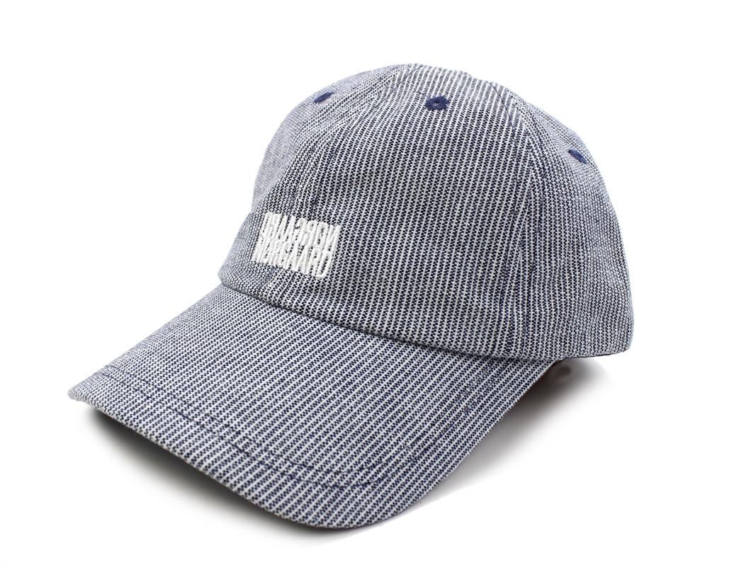 Stribet kasket i farverne estate blue og clod dancer med logo-tekst fra Mads Nørgaard.