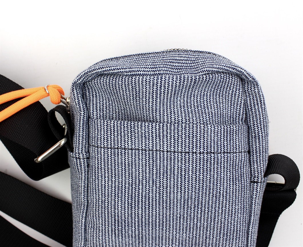 Stribet lille skuldertaske i farverne estate blue og cloud dancer fra Mads Nørgaard.