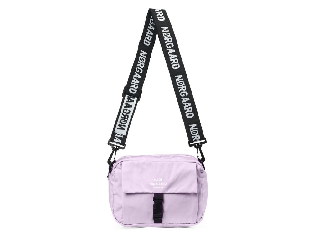 Mads Noergaard skuldertaske i lilla med logo skulderrem og udvendig lomme med klikspændeLilla crossbody taske fra Mads Noergaard med sort for