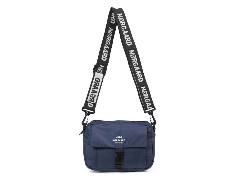Mørkeblå Mads Noergaard crossbody taske med logo skulderremMads Noergaard skuldertaske med orange kontrast for