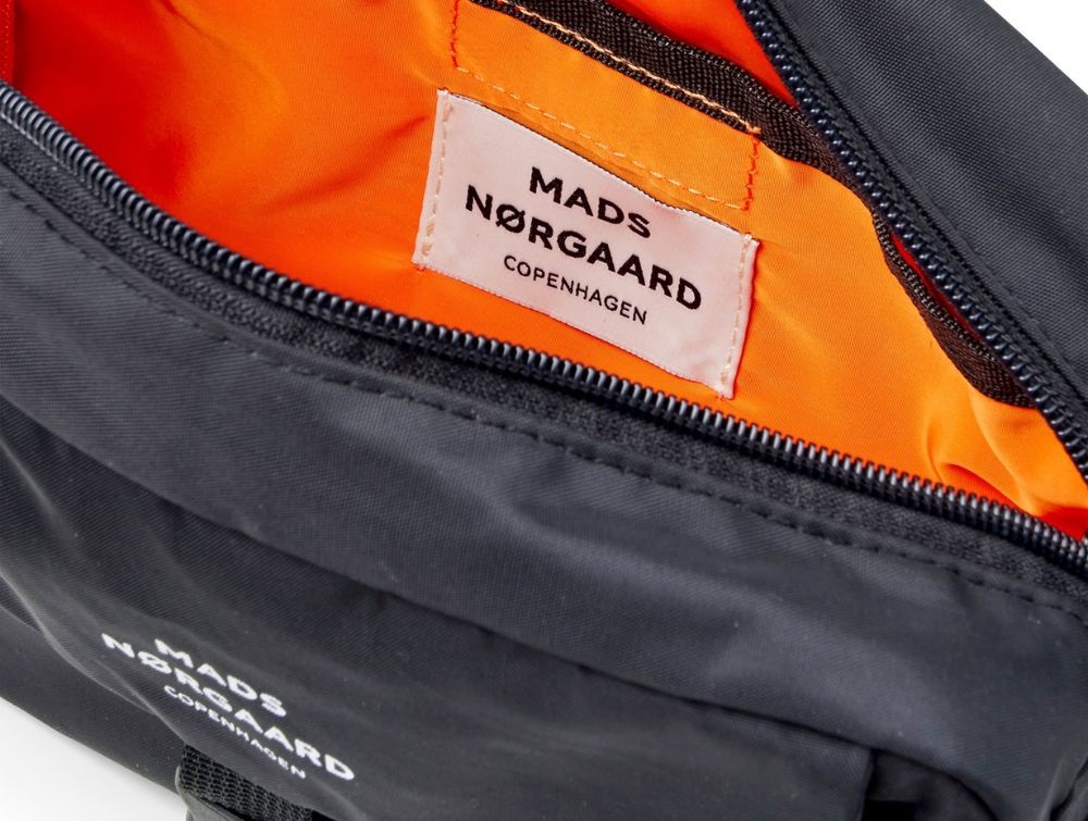 sort skuldertaske fra Mads Nørgaard med logo skulderremMads Nørgaard Tian skuldertaske sort med orange kontrast for