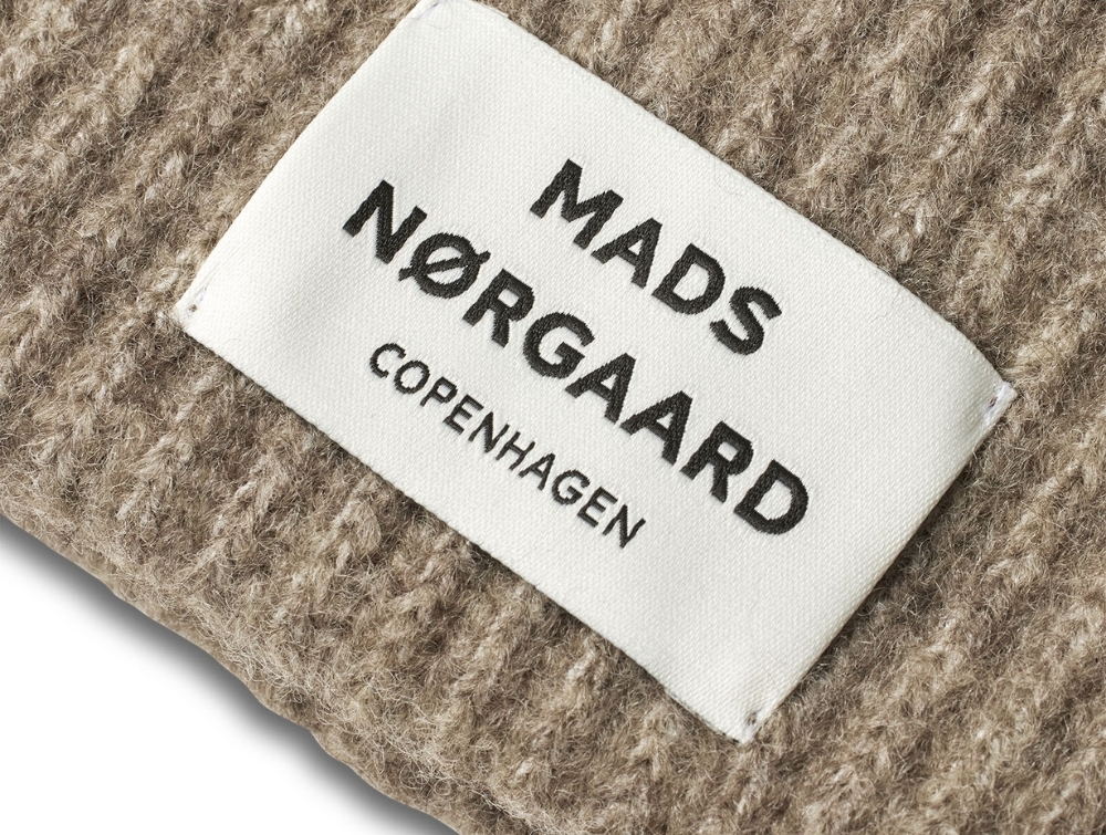 Ribstrikket Anju hue fra Mads Nørgaard i farven roasted cashewLogolabel på Anju hue i brun nuance fra Mads Nørgaard