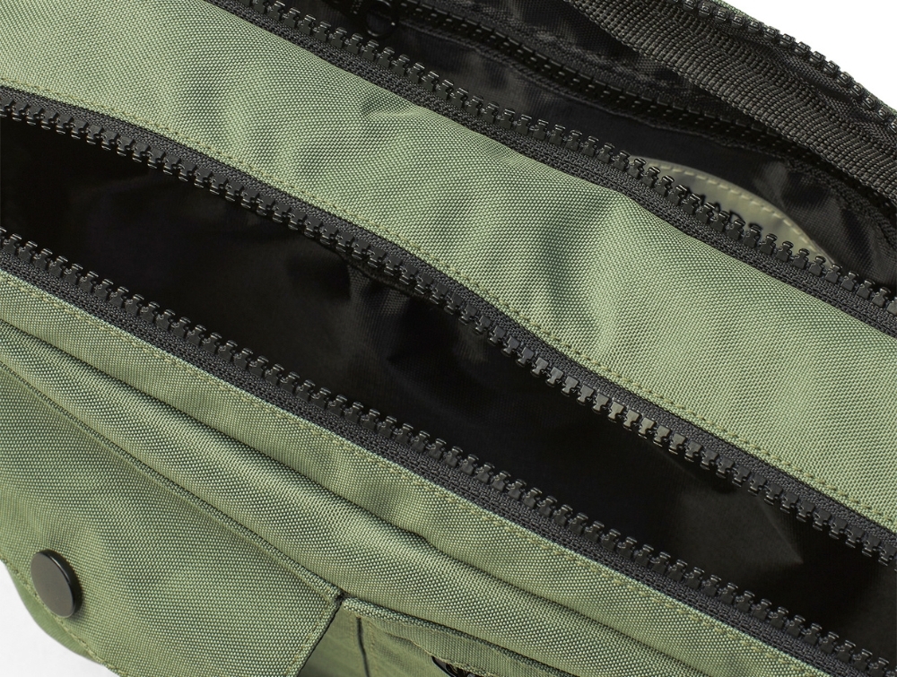 Mads Nørgaard Cappa taske i støvet grøn med sort logoremNærbillede af baglomme på grøn Mads Nørgaard taskeIndvendige lynlåse i grøn Mads Nørgaard Cappa taske