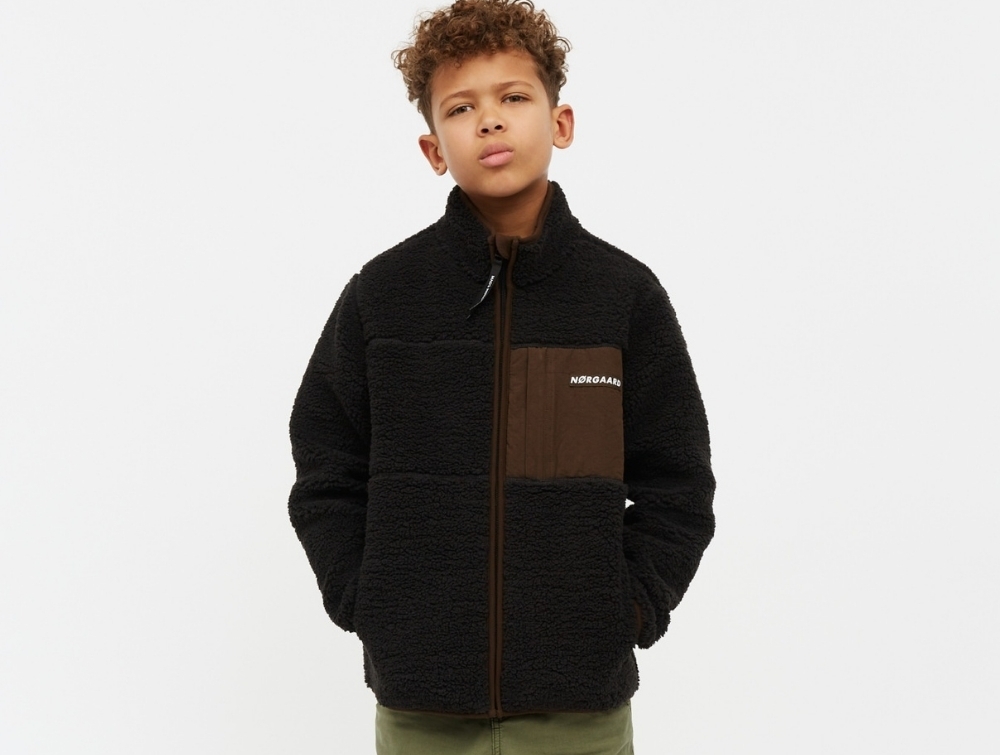 Mads Nørgaard fleecejakke i sort med brun brystlomme på barnMads Nørgaard fleecejakke i sort med brun brystlomme set forfraNærbillede af brun brystlomme med Mads Nørgaard logoMads Nørgaard fleecejakke i sort set bagfra