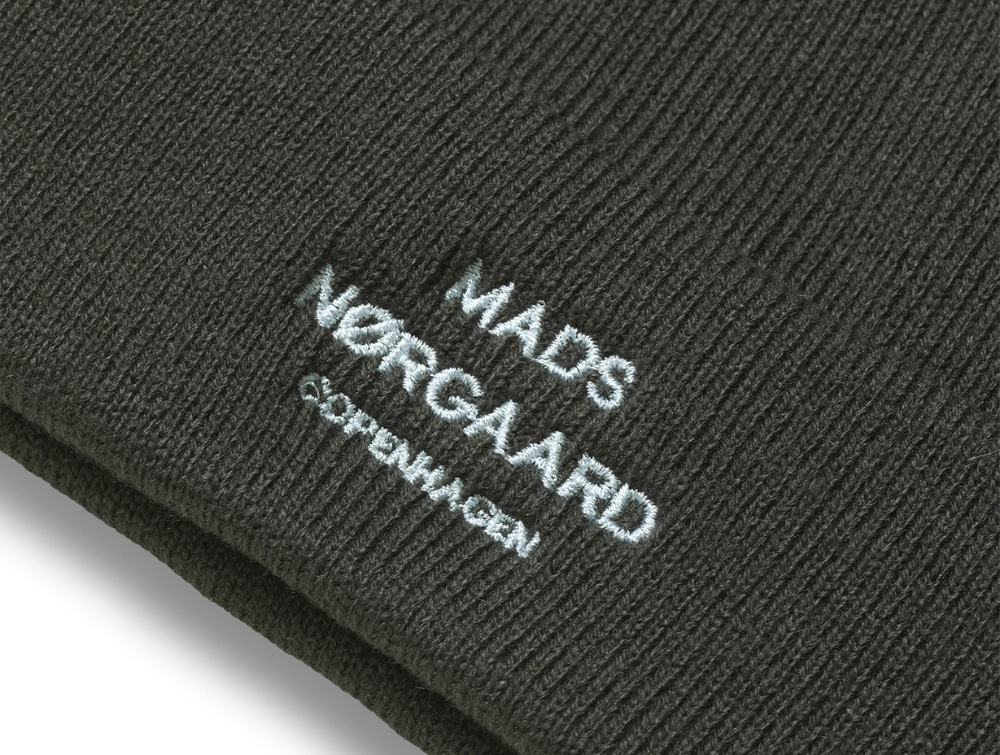 Mads Nørgaard hue i mørkegrå med broderet logoNærbillede af logo på Mads Nørgaard hue i mørkegrå