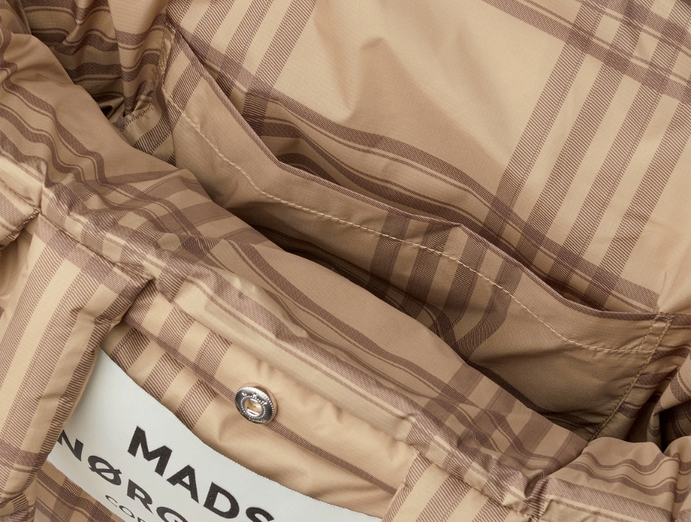Mads Nørgaard puffertaske med tern i beige og brunNærbillede af logo på ternet puffertaske i beige og brun fra Mads NørgaardIndvendigt rum og trykknap i ternet Mads Nørgaard taske i beige