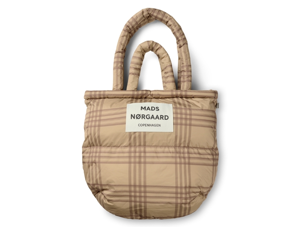 Mads Nørgaard puffertaske i beige og brun med tern og fleksible hanke