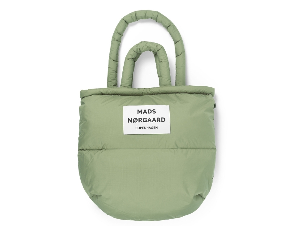 Taske i grøn nuance fra Mads Nørgaard. Tasken har polstret design, dobbelte hanke og synligt logo på fronten.