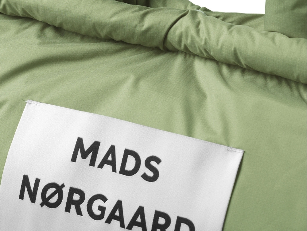 Mads Nørgaard quiltet taske oil green med dobbelte hanke og synligt logoDetalje af Mads Nørgaard quiltet taske oil green med stort logo