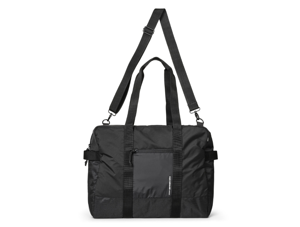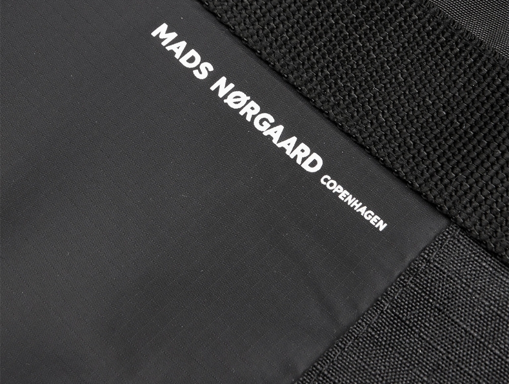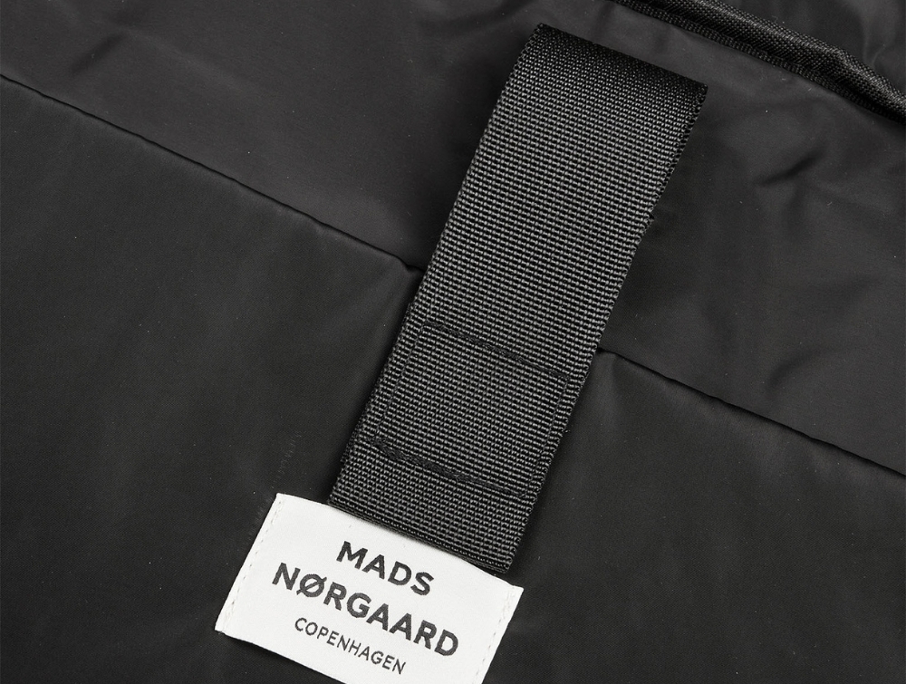 Mads Nørgaard rejsetaske i sort med justerbar skulderremMads Nørgaard taske bæres i hånden i sortNærbillede af Mads Nørgaard logo på sort rejsetaskeSort Mads Nørgaard taske med hvidt mærke og strop