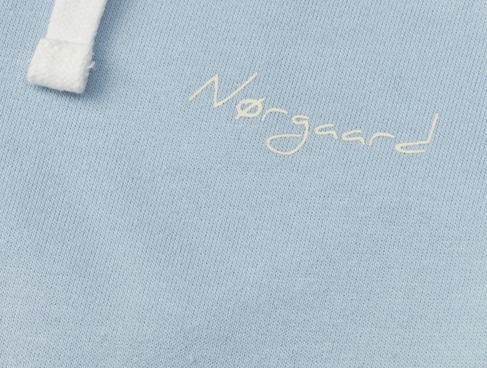 sweatpants fra Mads Nørgaard i lyseblå med logoprintnærbillede af lyseblå sweatpants fra Mads Nørgaard med hvidt logoprint