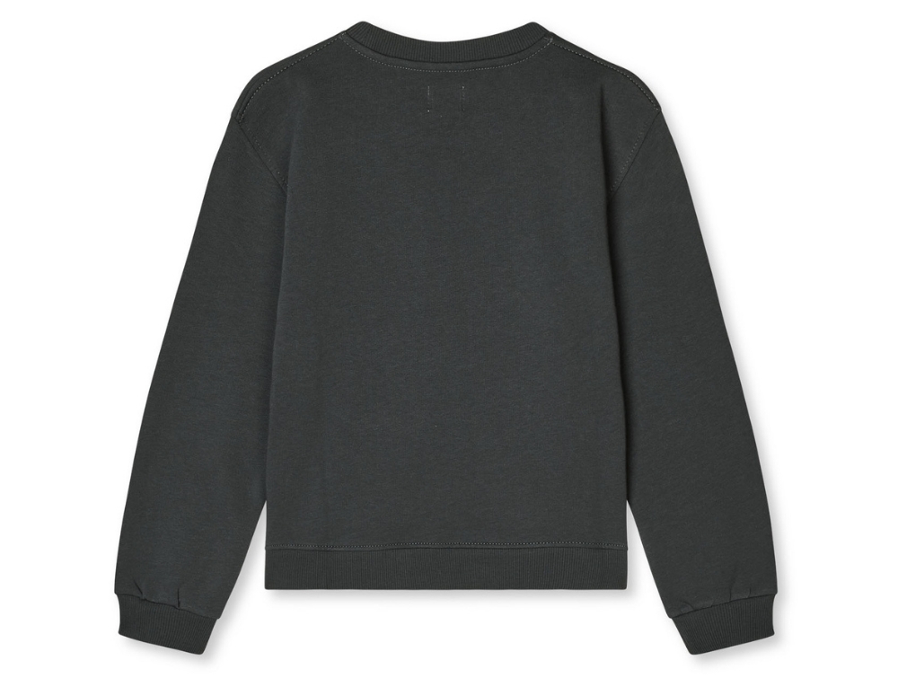 Mads Nørgaard sweatshirt i gråsort med lyseblåt logonærbillede af spejlvendt logo på gråsort sweatshirt fra Mads Nørgaardbagside af gråsort sweatshirt fra Mads Nørgaard uden print
