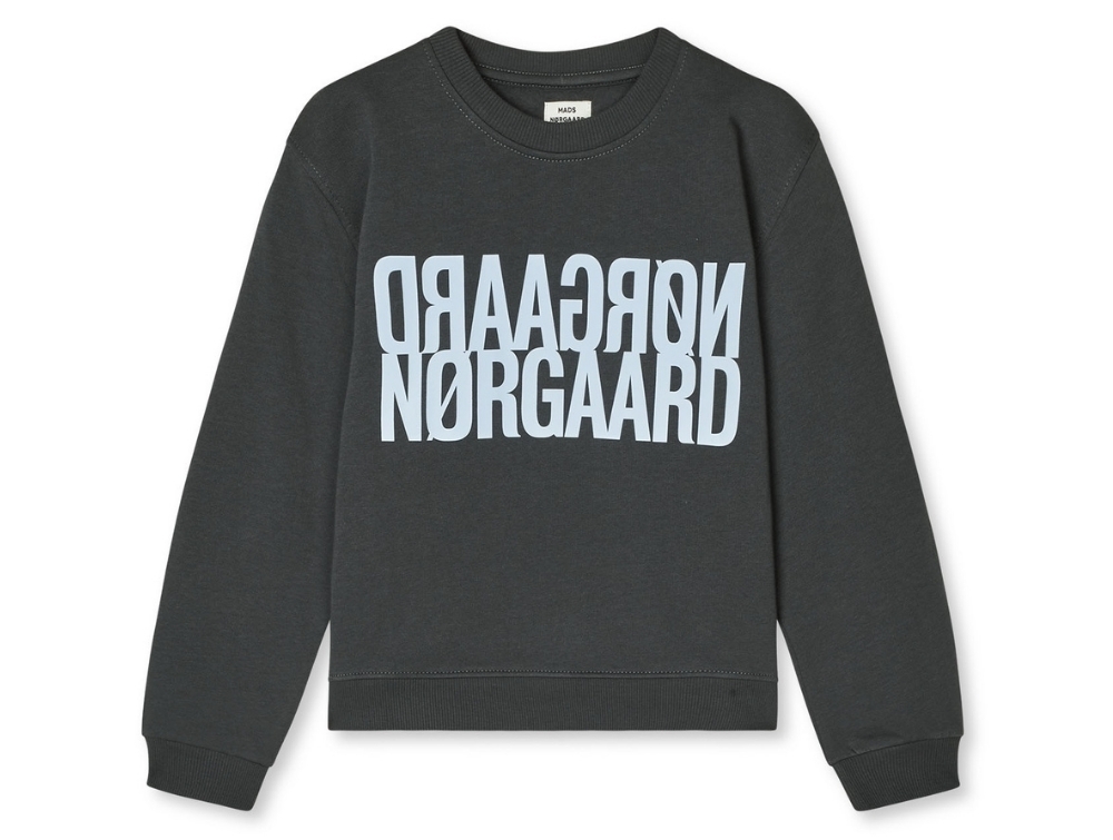 Sweatshirt i grå-sort (asphalt) fra Mads Nørgaard med stort lyseblåt spejlvendt logo på brystet.