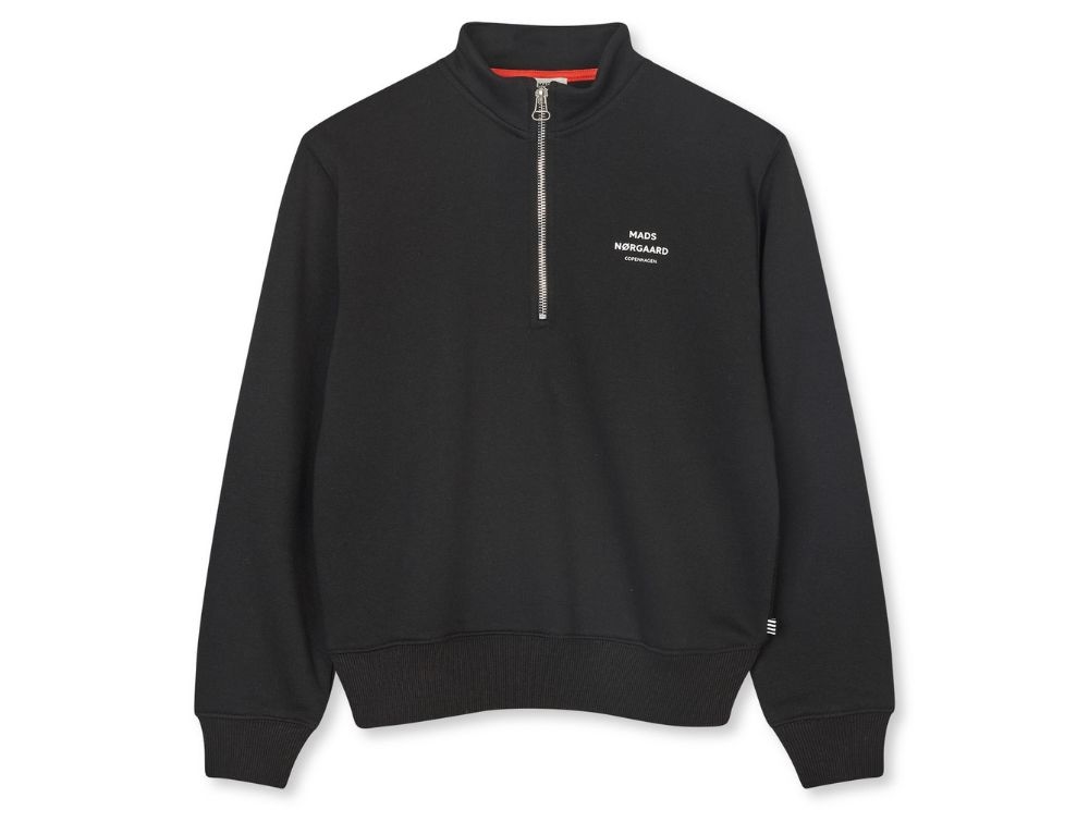 Half zip sweatshirt i sort nuance (jet black) fra Mads Nørgaard med diskret hvidt logo på brystet.