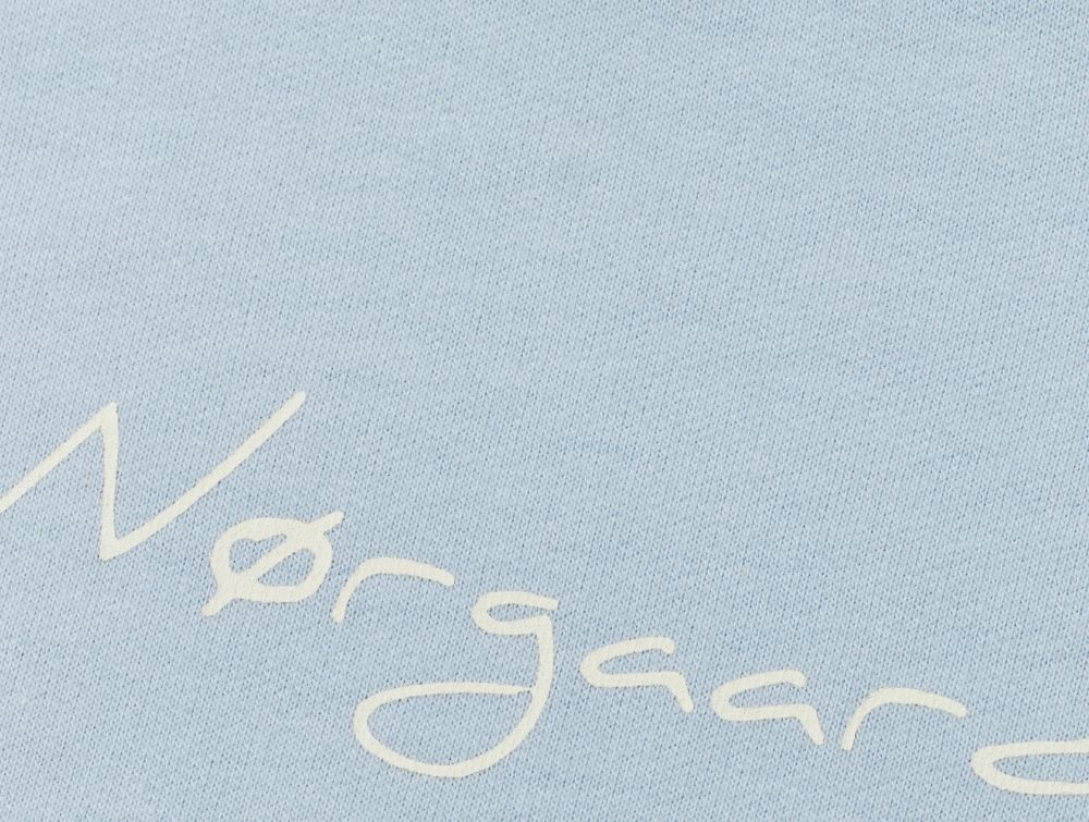 Mads Nørgaard sweatshirt lyseblå med hvidt logoprint og rund halsnærbillede af logoprint på lyseblå sweatshirt fra Mads Nørgaard