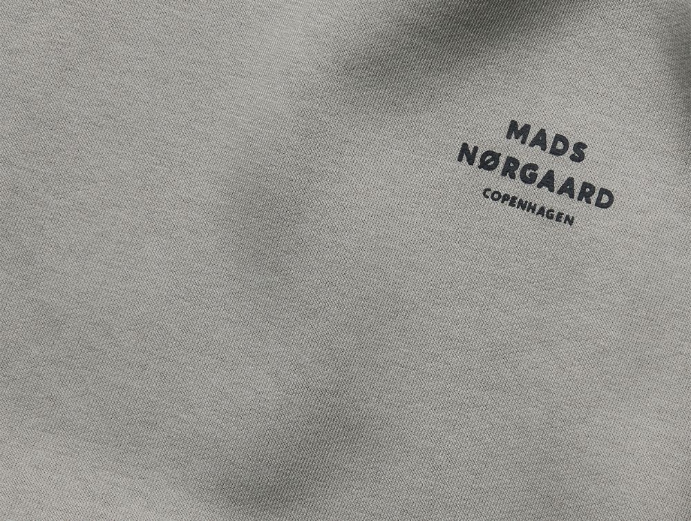 Mads Nørgaard sweatshirt i moon mist set forfra med hætteMads Nørgaard sweatshirt i moon mist set bagfra med hætteDetaljebillede af logo på Mads Nørgaard sweatshirt i moon mist