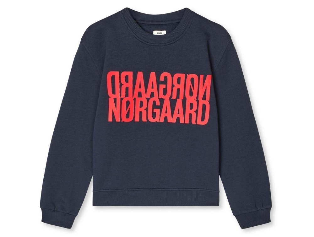 Mads Nørgaard sweatshirt i mørkeblå med spejlvendt rødt logoBarn iført mørkeblå Mads Nørgaard sweatshirt med rødt logoDetalje af spejlvendt Mads Nørgaard logo i rød på mørkeblå sweatshirtBagside af mørkeblå sweatshirt fra Mads Nørgaard uden print