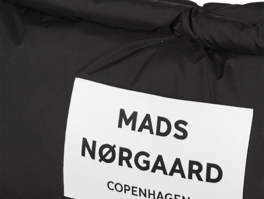 Sort taske fra Mads Nørgaard med korte og lange hankeNærbillede af Mads Nørgaard logo på sort puffertaske