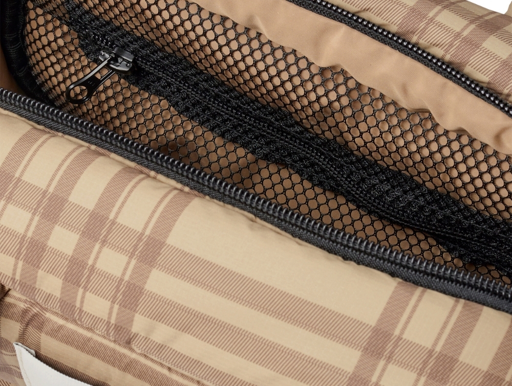 Tasken har en aftagelig, justerbar skulderrem og bløde faste hanke. Den lukkes med lynlås og har flere praktiske lommer indvendigt til organisering. Designet er let og sporty med et moderne ternet print.
