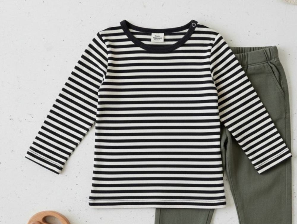 T-shirten er lavet i 100% økologisk bomuld og har en klassisk pasform med lange ærmer. Den har smalle striber og rund hals med trykknap ved skulderen, som gør den nem at få over hovedet. En blød og anvendelig basisstyle til hverdagens garderobe.