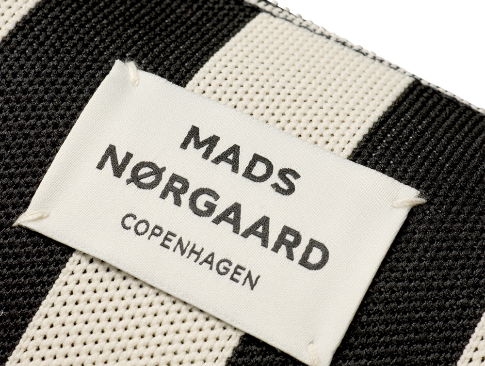 Mads Nørgaard Tote Bag i sort med hvide striber og logoNærbillede af logo på sort og hvid stribet tote bag fra Mads Nørgaard