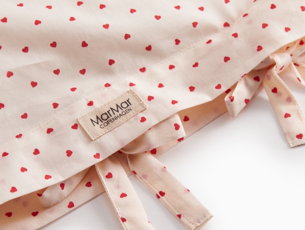 Baby sengetøj i råhvid nuance fra MarMar Copenhagen med små røde hjerter.
