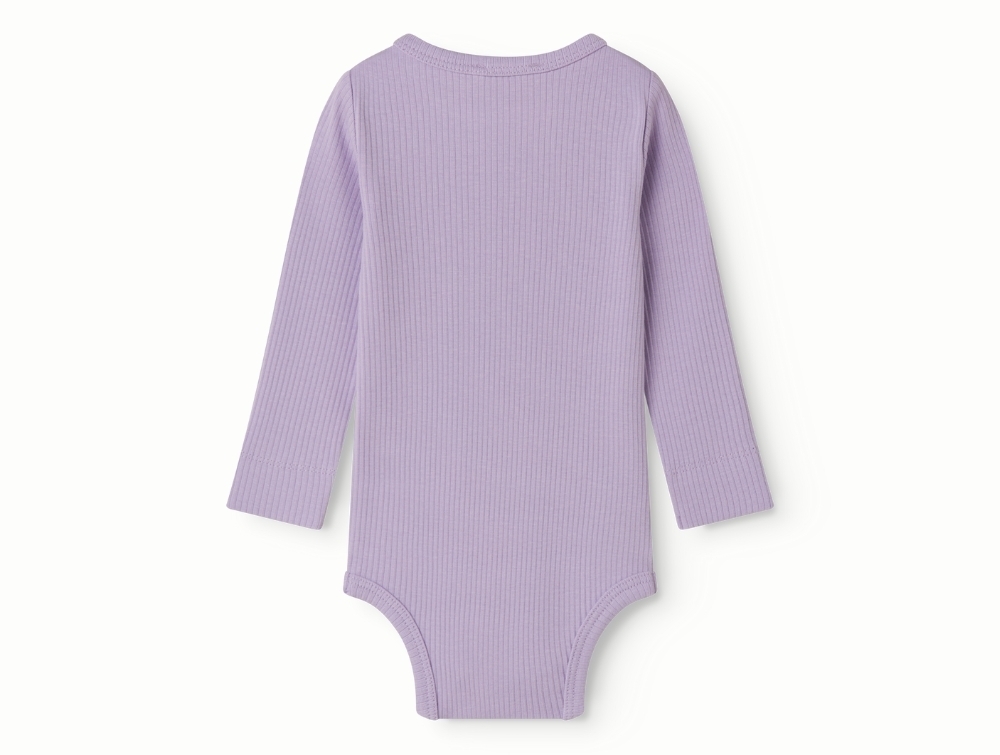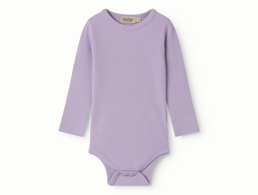 Langærmet body i lys lilla nuance (lilacs) fra MarMar Copenhagen fremstillet i blød ribkvalitet.