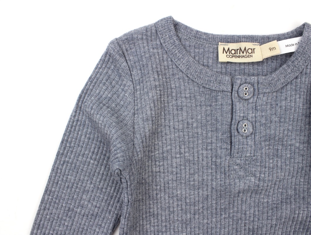 Langærmet body i rib med to knapper i farven moonstone melange fra MarMar Copenhagen.