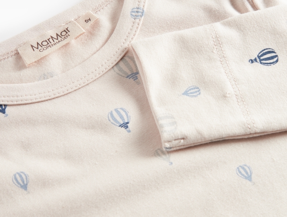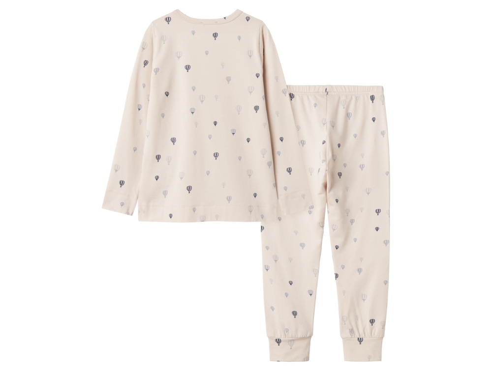 Designet består af en langærmet bluse og bukser med elastik i taljen. Pyjamasættet har et fint luftballonprint i blå toner og ribkanter ved ærmer og ben, som giver en god pasform.