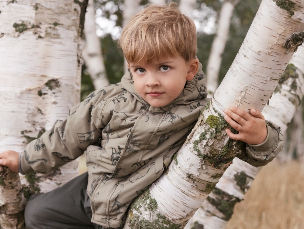 Osak jakke med dinosaur print fra MarMar Copenhagen med aftagelig hætte og tapede sømme