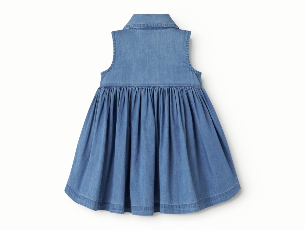 Pige klædt i MarMar Danal kjole i blue denimMarMar denimkjole til børn i blå nuanceMarMar kjole med knaplukning i blue denimMarMar Danal kjole set bagfra i blue denim