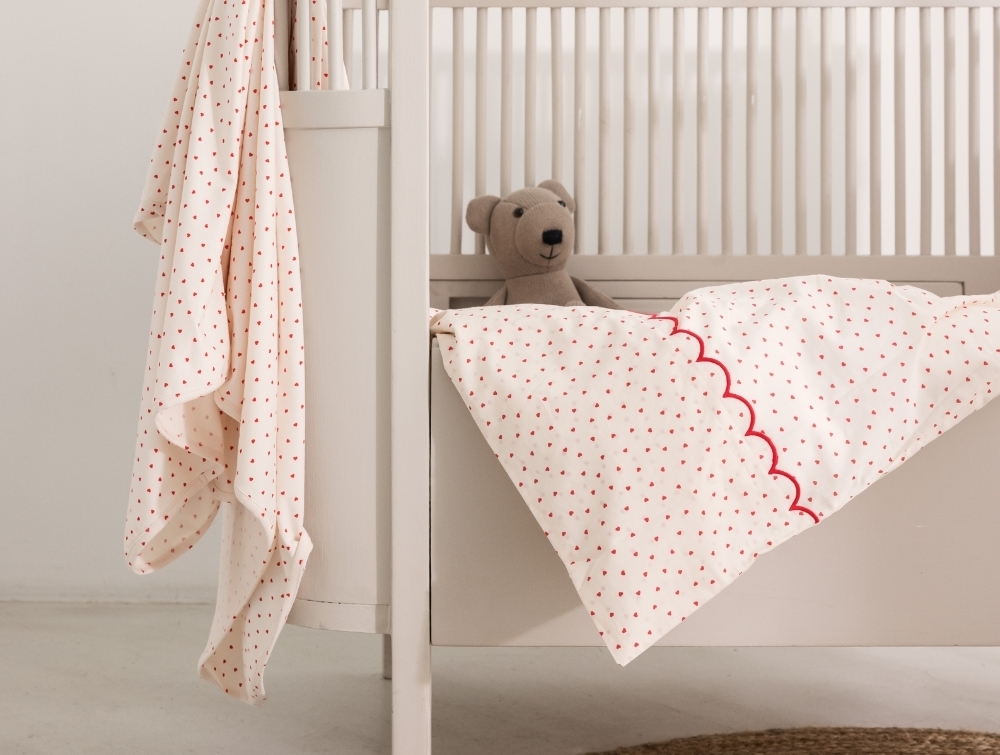 Junior sengetøj i råhvid nuance fra MarMar Copenhagen med små røde hjerter.