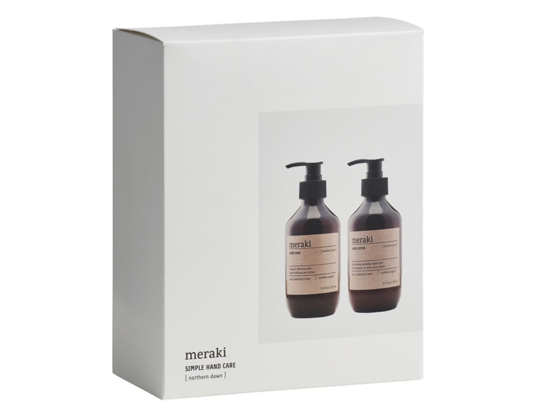 Gaveæske med 275ml håndsæbe og 275ml håndlotion med duften Northern Dawn fra Meraki.