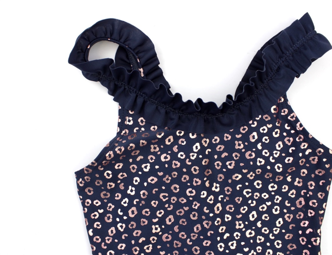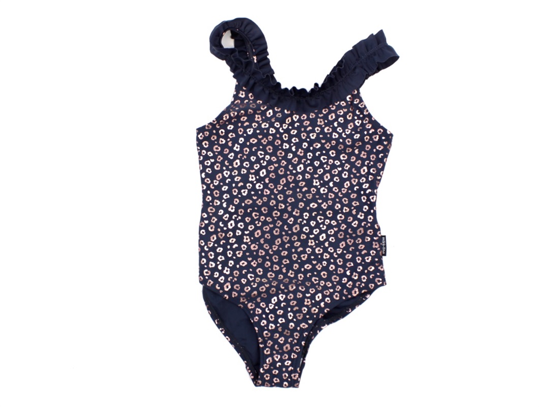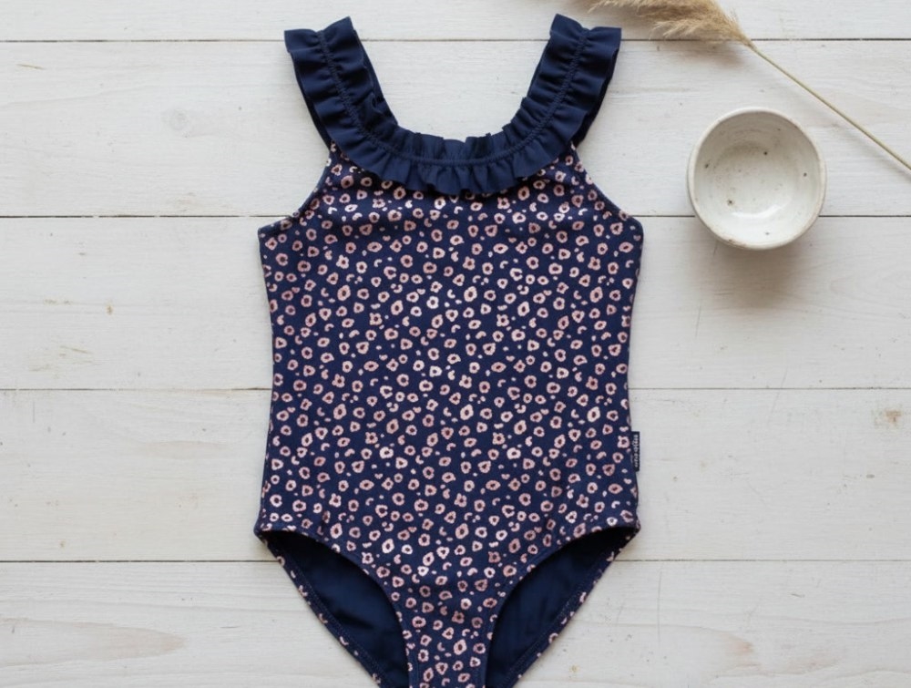 Mørkeblå badedragt med lyserødt glimmerprint og flæser fra Mikk-Line.